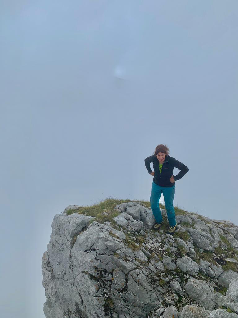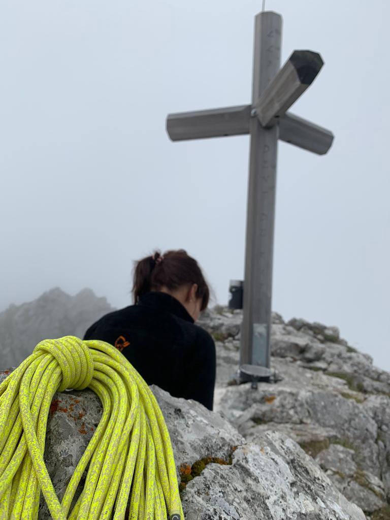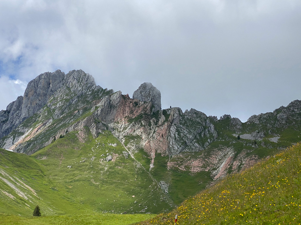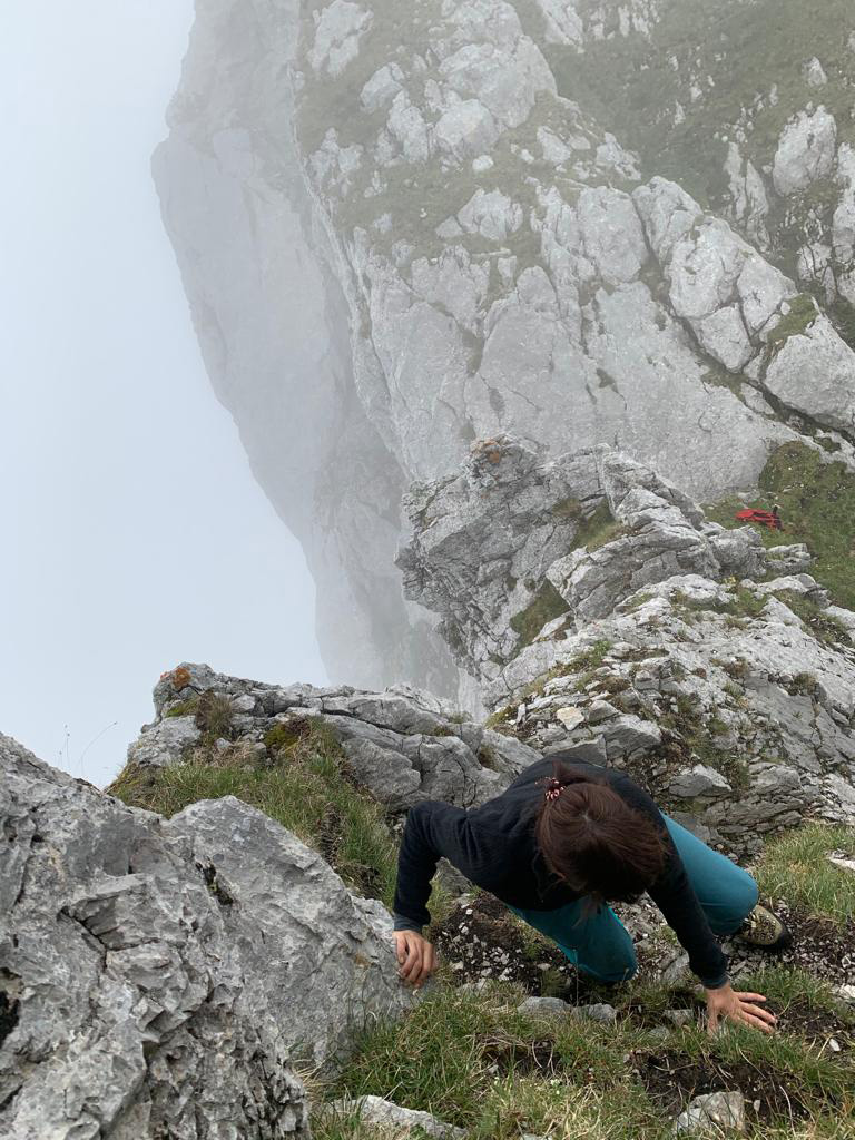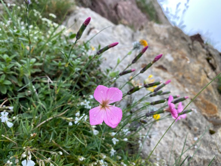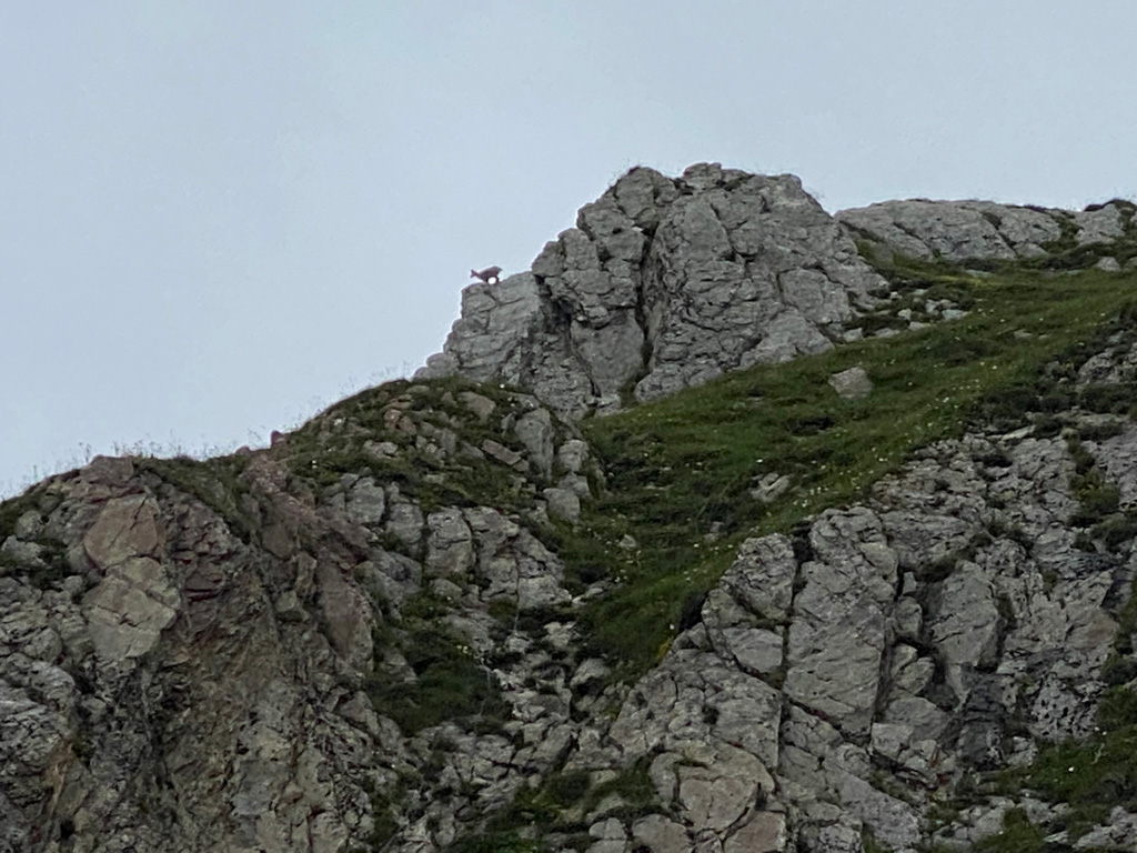 Begleitet von einer Gämse, die uns die längste Zeit beobachtete, und dem recht hysterischen Gepfeife der Murmeltiere in den Wiesen unter uns, krakselten wir wacker voran. Wir fragten uns, ob sich die Viecher bei dem von ihnen veranstalteten Lärm nicht gar zu sehr verausgaben, aber vielleicht pfeifen sie ja auch um die Wette und beeindrucken damit mögliche Partner. Wir liessen die Tiere hinter uns, und stiegen in die Felsen hinauf. Bald fanden wir blühende Stein-Nelken (Dianthus sylvestris), die an der Dent de Ruth fast bis zum Grat hinauf reichen. Oben angekommen, rissen die Wolken immerhin so weit auf, dass wir zwischendurch einen Blick auf die Grubenberghütte hinunter erhaschen konnten. Und im übrigen zeigte sich einmal mehr, dass gegen Höhenangst nichts so hilfreich ist wie Wolken… die Abgründe unter uns schienen ja watteweiss, und so gelang es mir bei dieser Tour bestens, die Gefahr mental auszublenden und mich immer nur auf den nächsten Schritt, den nächsten Griff zu konzentrieren. Oh, ich habe es sogar ohne Seil bis auf den Gipfel geschafft! So langsam, langsam gelingt es mir doch, mir die Höhenangst etwas abzutrainieren. Was dabei auch hilft: Zeit, und Geduld, und ein Begleiter, der an den Schlüsselstellen den einen oder anderen Tipp gibt. Merci Ruedi! Ehrlich gesagt war das wohl die langsamste Erstbesteigung der Dent de Ruth aller Zeiten… oder vielleicht auch nicht. Ruedi meinte, dass schon ab und zu Gäste mal etwas länger als die angegebene Stunde gebraucht hätten. Egal! Ich war oben. Hinunter ging’s dann ganz leicht – schade nur, dass die Abseilpiste nicht bis direkt vor die Hütte führt!