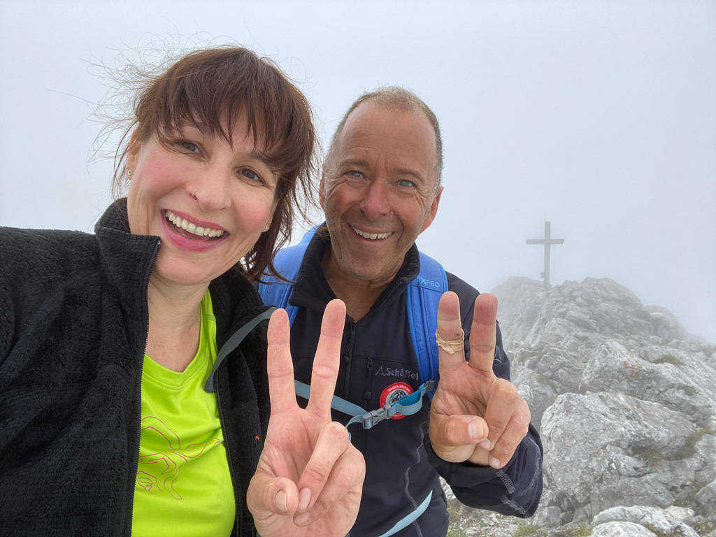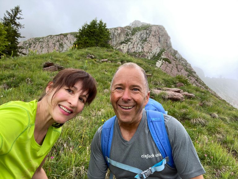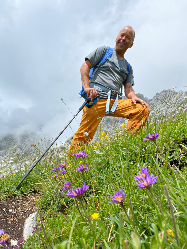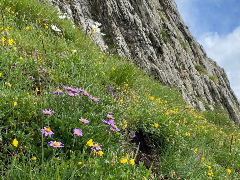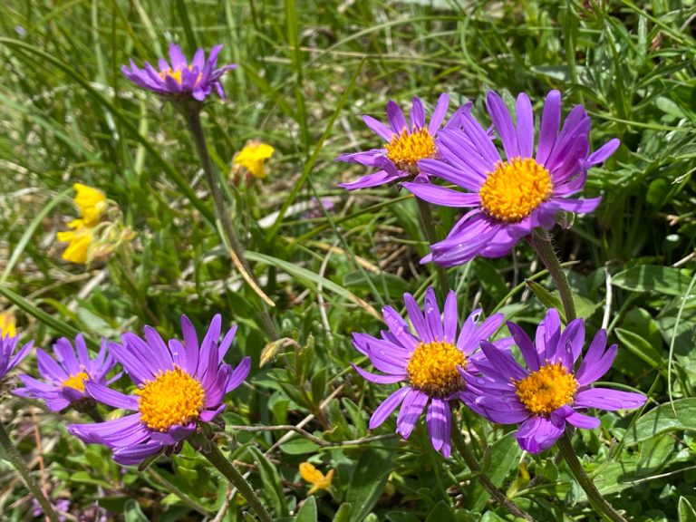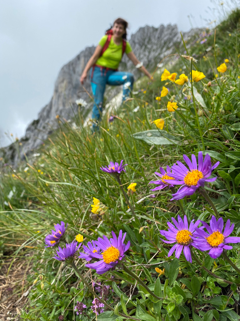Neulich bei einem kleinen Ausflug von Hikesandherbs auf die Dent de Ruth oberhalb der Grubenberghütte fanden wir Steilwiesen voller Alpenastern (Aster Alpinus). Was für eine Pracht, und was für eine Überraschung! Wie intensiv die Blüten leuchteten an dem nebelverhangenen Morgen im Juli, wo das Gras noch regennass, und die Tritte schmierig und glitschig waren. Sorgfältig hangelten wir uns an den vollgesogenen Büscheln in die Höhe, den Felsen entgegen. Wie die Blumen strahlten in diesem fahlen Nebellicht! Das intensive Lila der äusseren Zungenblüten intensivierte sich durch die senfgelben Röhrenblüten in der Mitte. Perfekterweise trug Ruedi Hählen an jenem Morgen eine ebenso senfgelbe Wanderhose, so dass er sich bestens ins Bild fügte. Die Astern sollen übrigens der Mythologie zufolge die Tränen der Göttin Astraea, der Göttin der Unschuld symbolisieren. Einer anderen Legende zufolge entstanden sie aus Sternenstaub, weshalb sie auch Alpen-Sternblumen genannt werden. So viele Alpenastern auf einmal verlockten uns natürlich dazu, auf dem abschüssigen und recht exponierten Hang innezuhalten und mit den Handys ein paar Fotos zu machen – wohl wissend, dass die Schlagzeile «Wanderleiter und Gartentante beim Alpenastern fotografieren abgestürzt» nicht so sexy wäre…