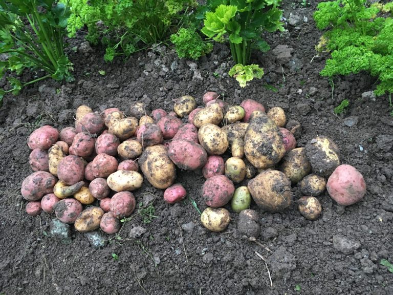 Die ganz grosse Ernte war das jetzt also noch nicht. Aber immerhin habe ich im Berggärtchen auf 1300 Meter über Meer eine Kiste voller Zwiebeln geerntet, und lasse diese nun auf der Terrasse in der Septembersonne trocknen. Auch bei den Kartoffeln gab es wenig, aber immerhin genug für eine grosse Schüssel eigenen Kartoffelsalat, sowie ein paar Bratkartoffeln. Die klassischen Charlotte, die ich seit Jahren immer pflanze, gediehen ganz ordentlich. Und die lustigen rotschaligen ‘Rote von Lauterburg’, die ich an einem Pflanzenmarkt am Bodensee gekauft und ins Oberland hinaufgetragen hatte, ja die gediehen auch. Allerdings vermute ich, dass ich nun weiss, warum die so selten geworden sind. Die Erne war nämlich wirklich sehr, sehr bescheiden. Trotzdem werde ich einige der roten Kartoffeln aufheben, um sie nächstes Jahr wieder zu pflanzen – einfach weil sie lustig aussehen. Und wer kann schon von sich behaupten, eine Rote von Lauterbrunnen in seinem Garten anzubauen?! Ja und der Federkohl, der hier oben so wunderbar gedeiht, den lasse ich noch stehen, bis er ordentlich durchfriert. Wie alle diese Kohlarten schmeckt auch der rote Federkohl viel milder und besser nach den ersten Frösten. Das gilt übrigens auch für den Rosenkohl, auch wenn man ihn im Laden meist schon früher kaufen kann. Aber manche Gemüse schmecken eben später im Jahr halt besser.