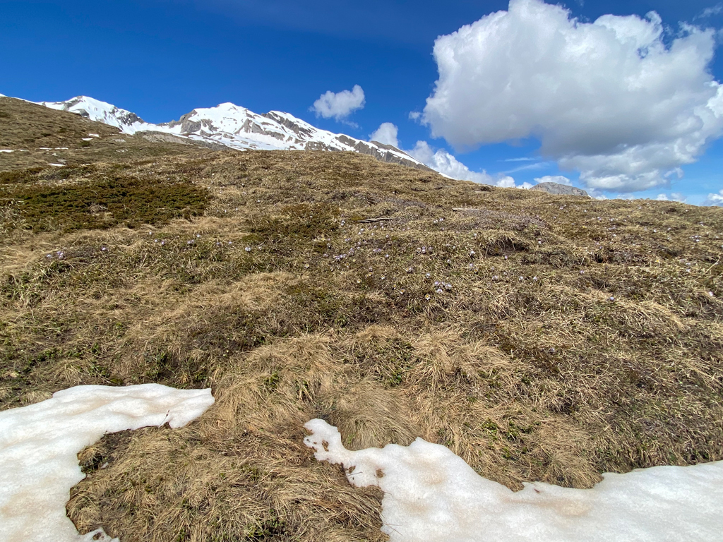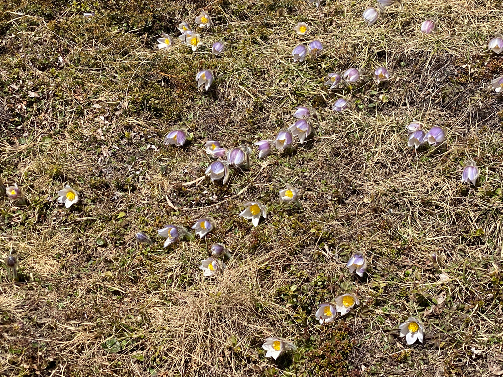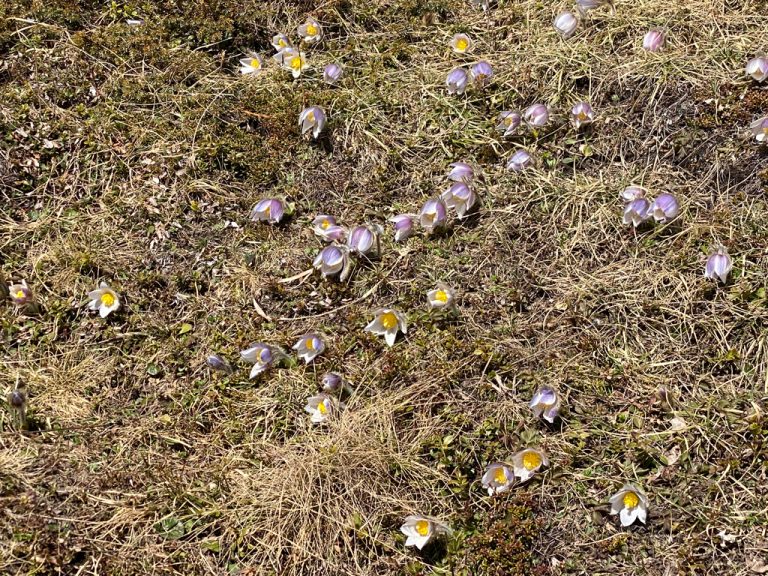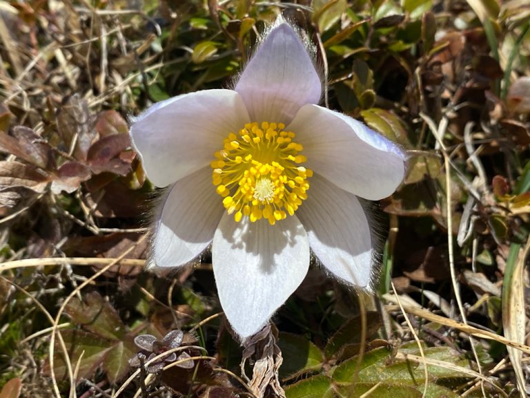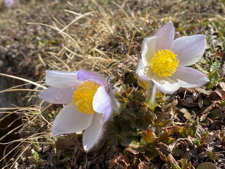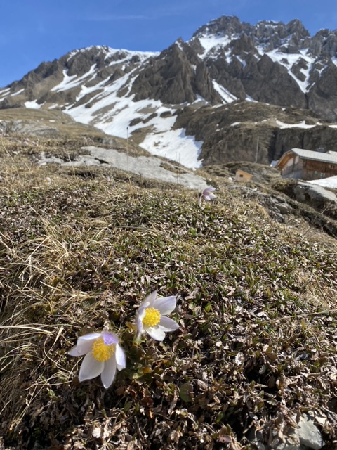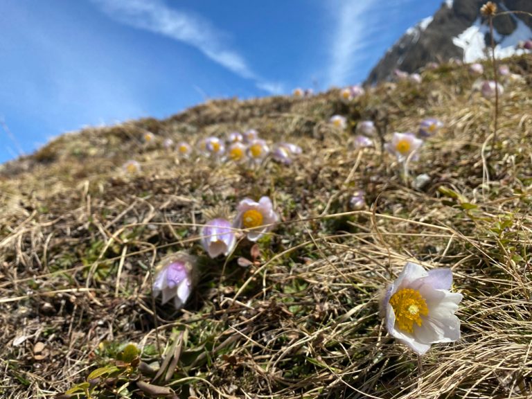 Weisse Pelzanemonen, soweit das Auge reicht: neulich auf einer späten Frühlingsskitour auf den Arpelistock (3060 m.) begegneten uns Bergmatten voller weisser Kuhschellen oder Küchenschellen (Pulsatilla vernalis). Es waren Tausende – nicht übertrieben. Wahrlich ein überwältigender Anblick! Jede einzelne Blüte ist ein Kunstwerk der Natur – wie die pelzig behaarten Hochblatthüllen einen 5 bis 7 cm breiten Kelch bilden, aus dem die goldgelben Staubblätter leuchten, schöner ginge es nicht. Dazwischen rannten frühlingsfreudig die Murmeltiere umher – nun ist mir klar, warum die Kuhschellen im Volksmund auch Mungenschnutzen genannt werden. Fressbar sind sie allerdings nicht – Kuhschellen gehören zur Familie der Hahnenfussgewächse (Ranunculaceae) und sind giftig. Wohl heissen sie so, weil Murmeltiere und Kuhschellen im Frühling gleichzeitig auftauchen.