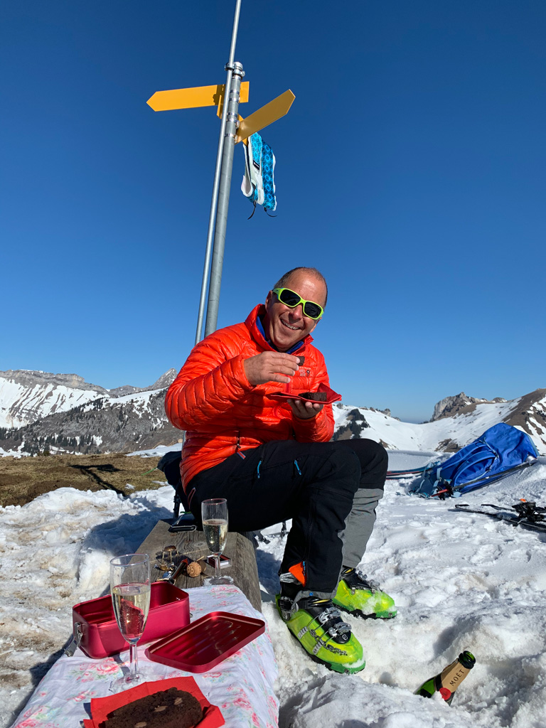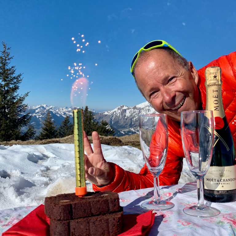 Was haben wir uns gefreut, dass die kleinen Tischfeuerwerke auch bei gleissendem Sonnenlicht im Schnee zu sehen sind! Manchmal sind es ja die ganz kleinen Dinge, über die man sich besonders freuen mag… zum 54. Geburtstag von Ruedi haben wir also mal getestet, was wir euch punkt Gipfel-Geburtstagsfeiern bieten könnten – für die Zeiten nach Corona. Und wenn ihr dann in besseren Zeiten selber mal mit Hikes&Herbs Geburtstag feiern möchtet, sei es mit Häppchen aus Sabines Garten oder mit dem legendären Missisippicake – wir sind da und wir freuen uns, wenn wir nach diesem ewig scheinenden Lockdown bald wieder Gäste empfangen dürfen!