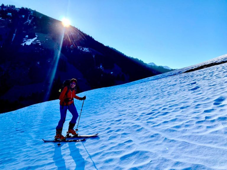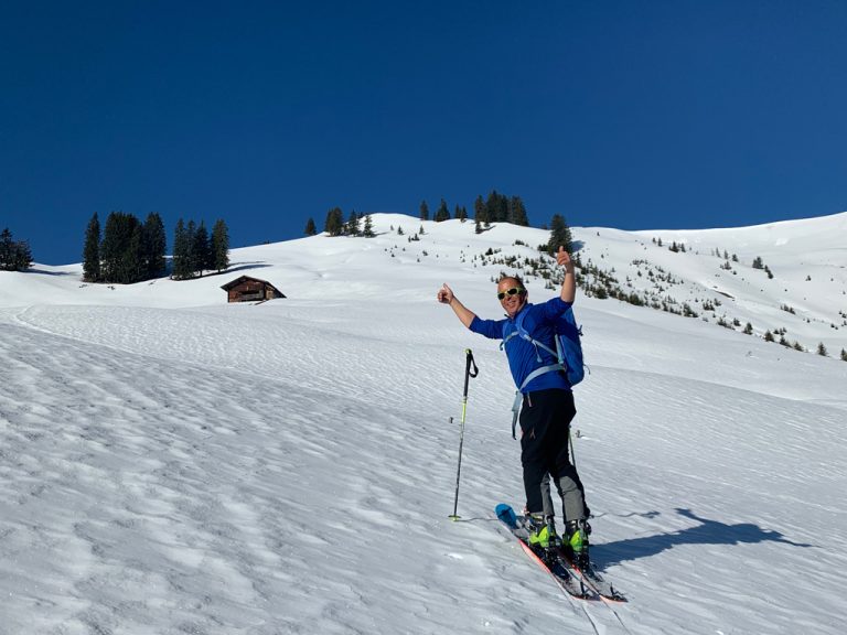 Übrigens haben wir dann eine herrliche Abfahrt durch perfekt aufgesulzten Schnee genossen. Wir sagen jetzt nicht wo genau… man soll ja jetzt niemanden konkret in Versuchung bringen und sowieso nur noch ganz kleine Touren unternehmen und keinerlei Risiken eingehen. Irgendwie ist das alles schon sehr traurig, und es tut uns leid um alle, die nicht einfach mal schnell aus dem Haus und direkt auf die Tourenski können – derzeit sind die Schneeverhältnisse in der Höhe mehr als perfekt, aber eben, wir dürfen bis auf weiteres wegen Corona keine Gäste empfangen. Umso mehr bleibt uns allen die Vorfreude auf bessere Zeiten!