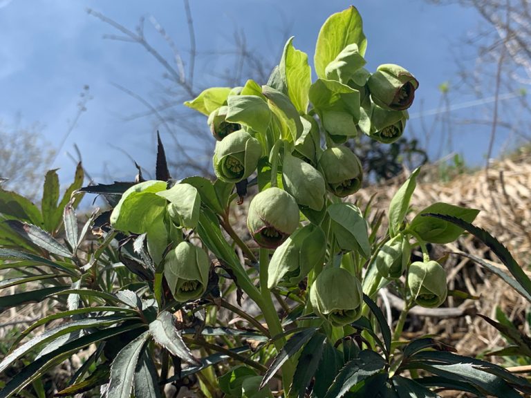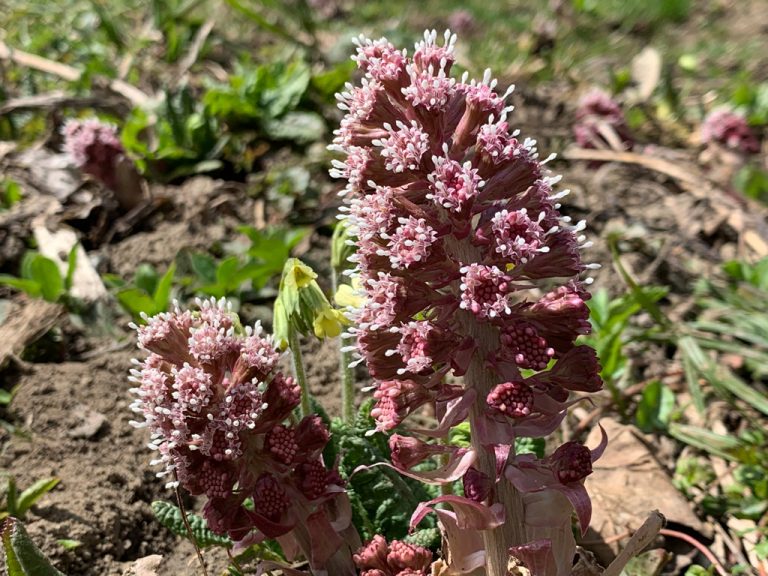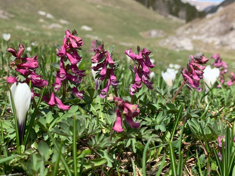 Alsbald fanden wir Stinkenden Nieswurz (Helleborus foetidus) an sonnigen, felsigen Hängen, und nicht wenig davon. Auch vom Alpen-Pestwurz (Petasites paradoxus) gibt es auf dieser Wanderung jede Menge zu sehen, ebenso wie Huflattich, Schlüsselblümchen und diverse Alpenveilchen. Interessant fanden wir aber besonders die Pestwurz. Denn die Blüten dieser merkwürdigen Pflanze sehen von nahem aus wie die stilisierten Zeichnungen vom Corona-Virus. Im Mittelalter wurden sie als Heilmittel gegen die Pest verwendet. Später schritten wir über Wiesen voller Elfenkrokus, die sich hier oben in apartigster Weise mit rosarotem Lerchensporn (Corydalis) paaren – eine Kombination, die man sich für den Garten merken sollte! Sumpf-Dotterblumen (Caltha palustris) sahen wir ebenfalls nicht wenige – wobei diese ja im ganzen Saanenland weit verbreitet und nicht zu übersehen sind.