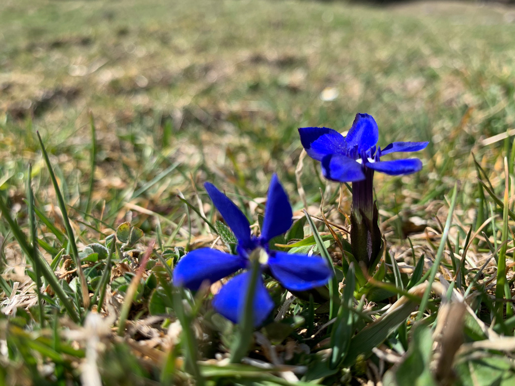 Als wir zur Kapelle kamen, die etwas höher gelegen ist, fanden wir die ersten Soldanellen (Alpenglöckchen) des Jahres, sowie einige wirklich hübsche Frühlings-Enziane (Geniana verna). Dies sind die kleinsten aller Enziane, aber ihr Kobaltblau leuchtet nicht minder intensiv. Sie werden auch Schusternägeli oder Himmelsbläueli genannt.