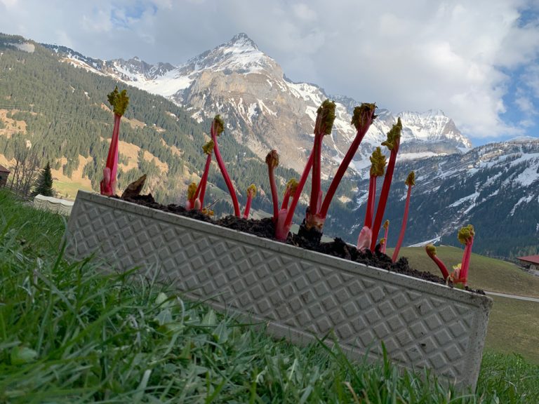 Die ersten Rhabarbern sind immer die allerbesten. Noch viel besser schmecken diese, wenn sie gebleicht wurden. Dann nehmen sie eine hellrosarote Farbe an und schmecken richtig zart und süss. Denn in der Dunkelheit werden Oxalsäure und Bitterstoffe abgebaut. Bei unseren alten Rhabarberstöcken im Garten haben wir einfach zeitig im März ein paar Wurzelstücke ausgestochen und diese in einem Kistchen mit feuchter Erde für drei Wochen in den stockfinsteren Keller gestellt.