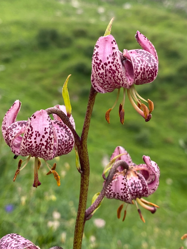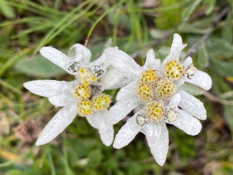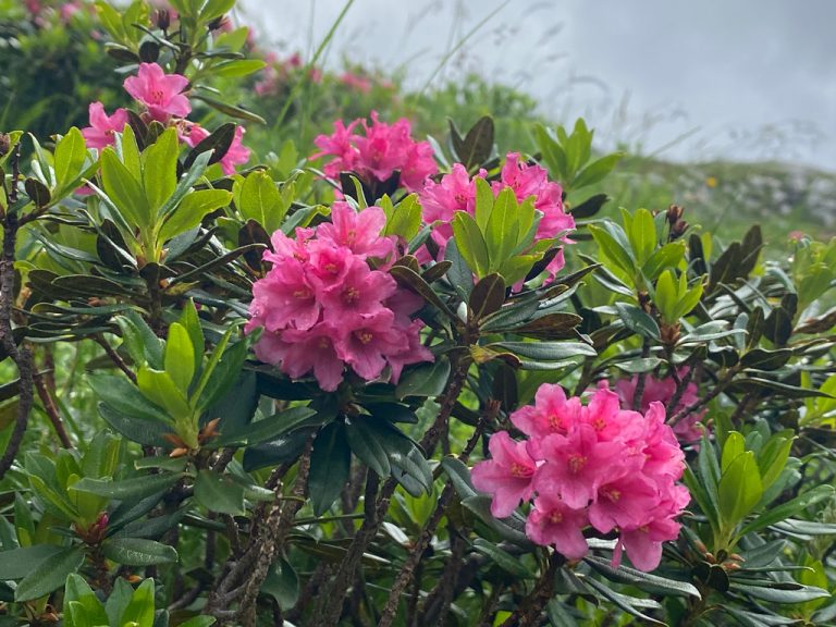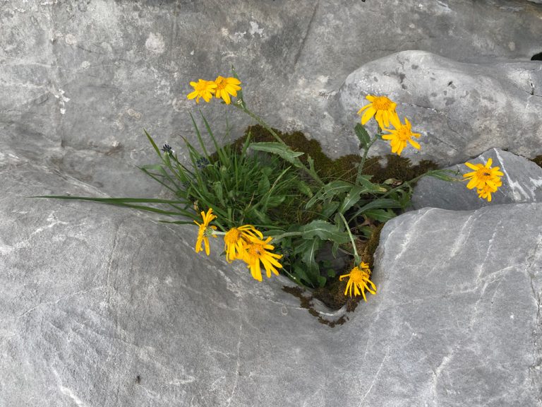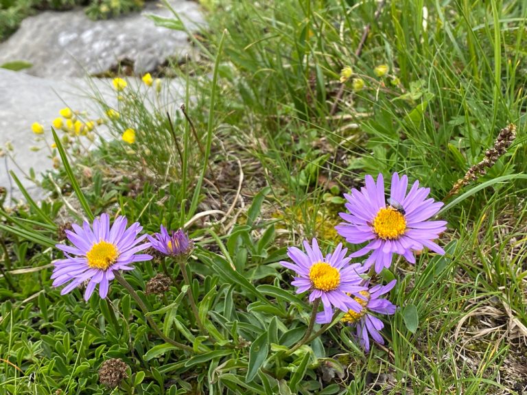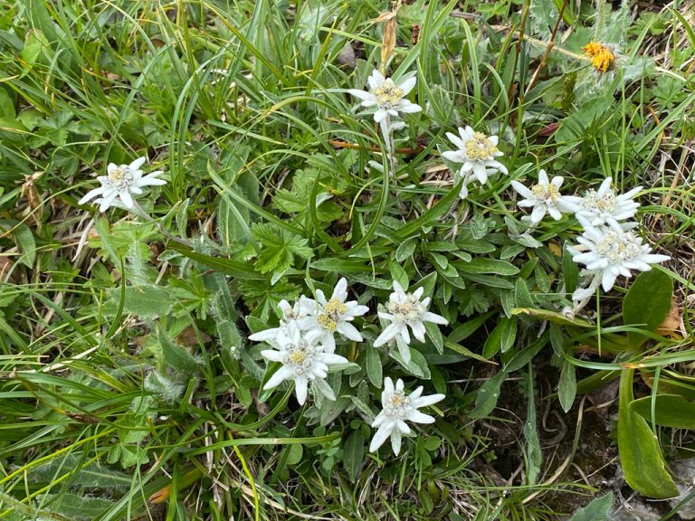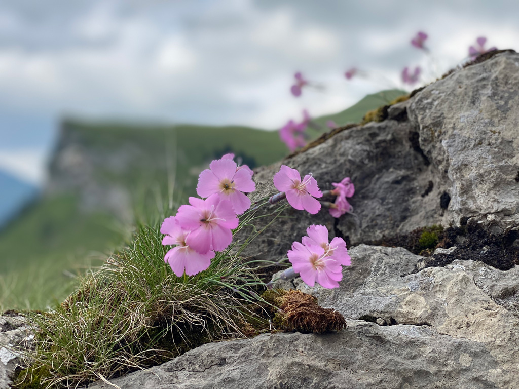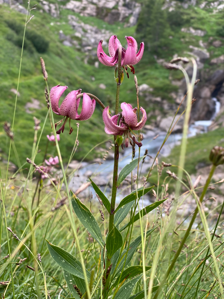Eine der schönsten Blumenwanderungen im Saanenland führt vom Lauenensee zur Geltenhütte SAC hinauf. In gut zwei Stunden gelangt man vom See recht steil hinauf zum Geltenschuss – der Wasserfall ist diesen Sommer besonders eindrücklich, weil er so viel Wasser führt. Von dieser bei vielen Gästen als Kraftort beliebten Hochebene führt der Weg steil hinauf durch Geröll und ein Stück weit auch unter einem kleineren Wasserfall hindurch. Für Erfrischung ist also gesorgt! Im obersten Bereich wird es dann botanisch richtig interessant. Hier gibt es eine reiche Blumenvielfalt wie fast nirgendwo anders. Paradieslilien und Türkenbund wechseln sich ab. Es gibt zahlreiche Arnikas, die man an ihren stets zerzausten Blüten erkennt – im Gegensatz zum Gämswurz, dessen Blüten immer ganz hübsch gezeichnet sind, wie grosse gelbe Margeritten. Sie kommen auf diesem Bergweg beide in grosser Zahl vor. Sterndolden und viele Orchideen, so auch die intensiv nach Vanille duftenden, fast schwarzen Männertreu, und grössere, pinkige Kugelorchideen gibt es zuhauf. Im oberen Bereich kurz vor der Hütte findet man auch den zarten wasserblauen Alpenlein – eine Schönheit sondergleichen. Und natürlich gibt es Silberwurz und Alpenröschen bis zum Abwinken. Aber die blühen ja überall im Berner Oberland in grosser Zahl. Was hingegen den Aufstieg zur Geltenhütte in botanischer Hinsicht sehr lohnend macht, sind die zarten rosaroten Nelken und die unzähligen Edelweiss. Beide findet man etwas oberhalb der Hütte auf den felsigen Grasbändern. Hier blühen im Frühling auch viele Enziane und Aurikeln. Oh und wenn wir schon hier sind: In der Geltenhütte gibt es feine hausgemachte Kuchen und den weitherum besten Latte Macchiato, den man in einer SAC-Hütte bekommen kann. Und wer bis hierhin noch nicht genug Blumen gesehen hat, nimmt den Weg ins Rottal hinauf richtung Arpeilstock. Das ist ein weiss-blauer Alpinweg, der etwas Erfahrung und Trittsicherheit erfordert. Dafür wird man mit Edelweiss à gogo belohnt. Auch auf dem Bergweg zur Wildhornhütte dürfte man in dieser Hinsicht mehr als fündig werden.